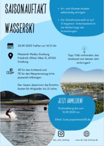 Wir treffen uns am 20.09.2025 (So.) um 14:15 Uhr beim “Wasserski Wedau Duisburg”. Die eigentliche Veranstaltung wird um 15 Uhr beginnen und zwei Stunden andauern. Die Anreise-Adresse ist die