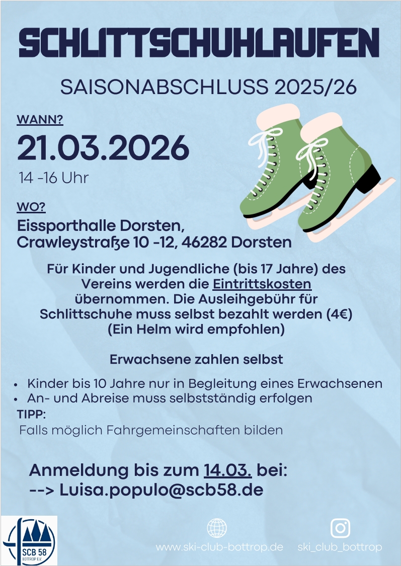 Am 21. März 2026 laden wir alle Kinder und Jugendlichen des Vereins zum gemeinsamen Schlittschuhlaufen ein! Der Verein übernimmt die Kosten für Eislaufen.